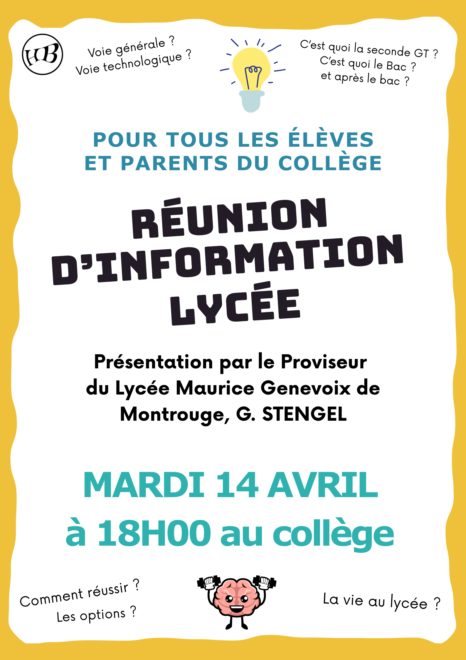 Mesdames, Messieurs les parents d’élèves du collège de la 6e à la 3e, Aux élèves, Vous êtes invité le mardi 14 avril à 18H00 pour la présentation et un échange avec le Proviseur du Lycée Maurice Genevoix de Montrouge, lycée de (...)